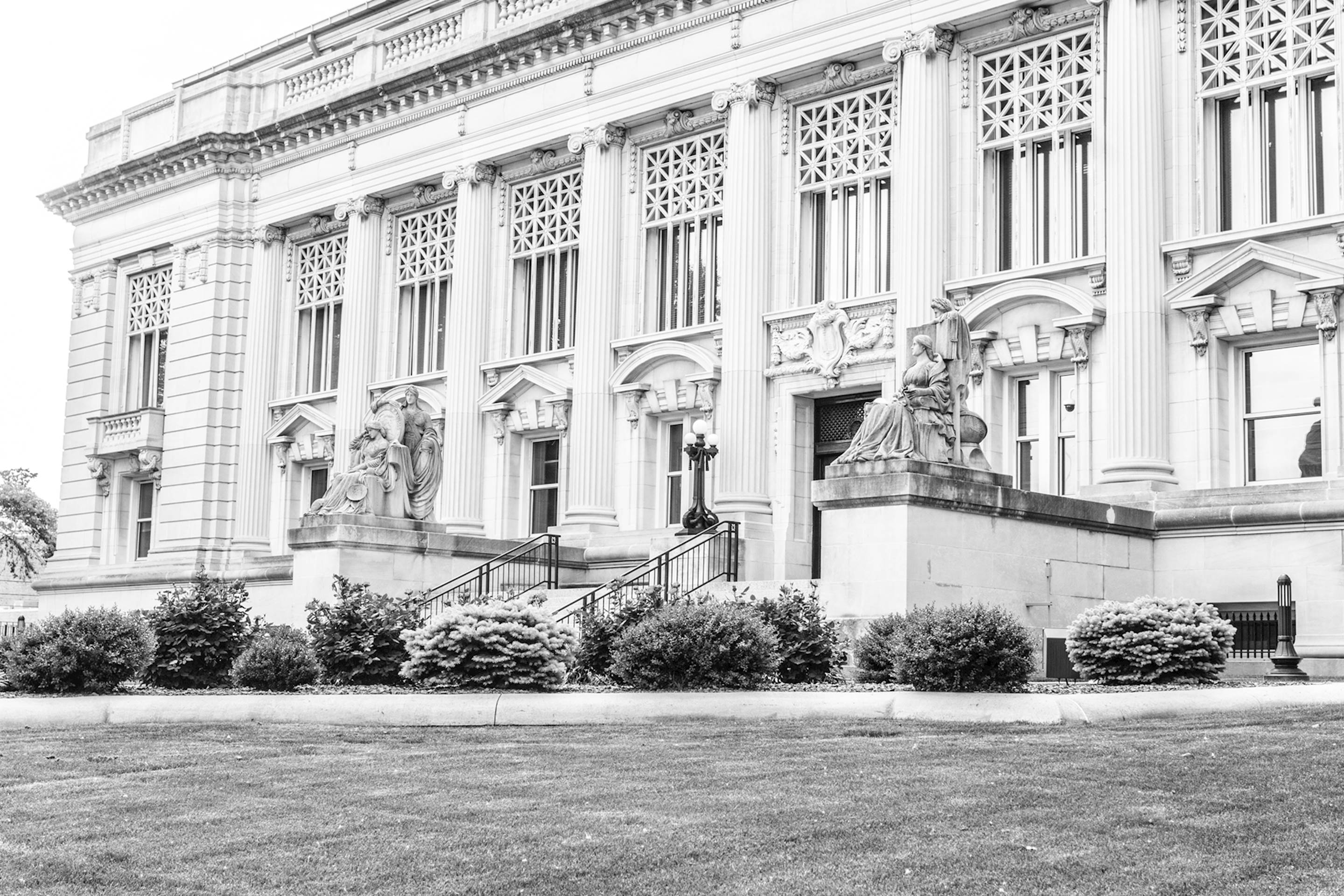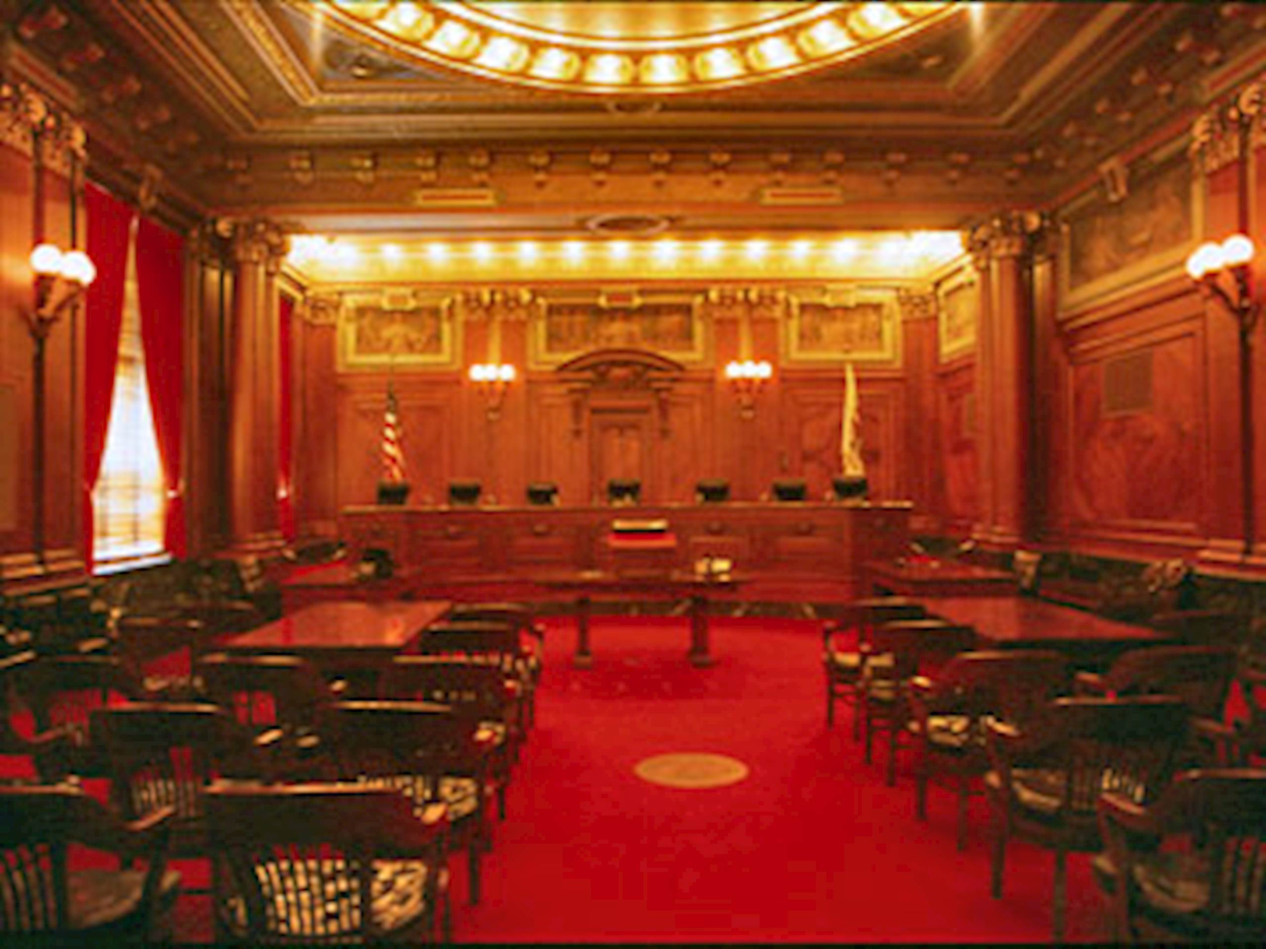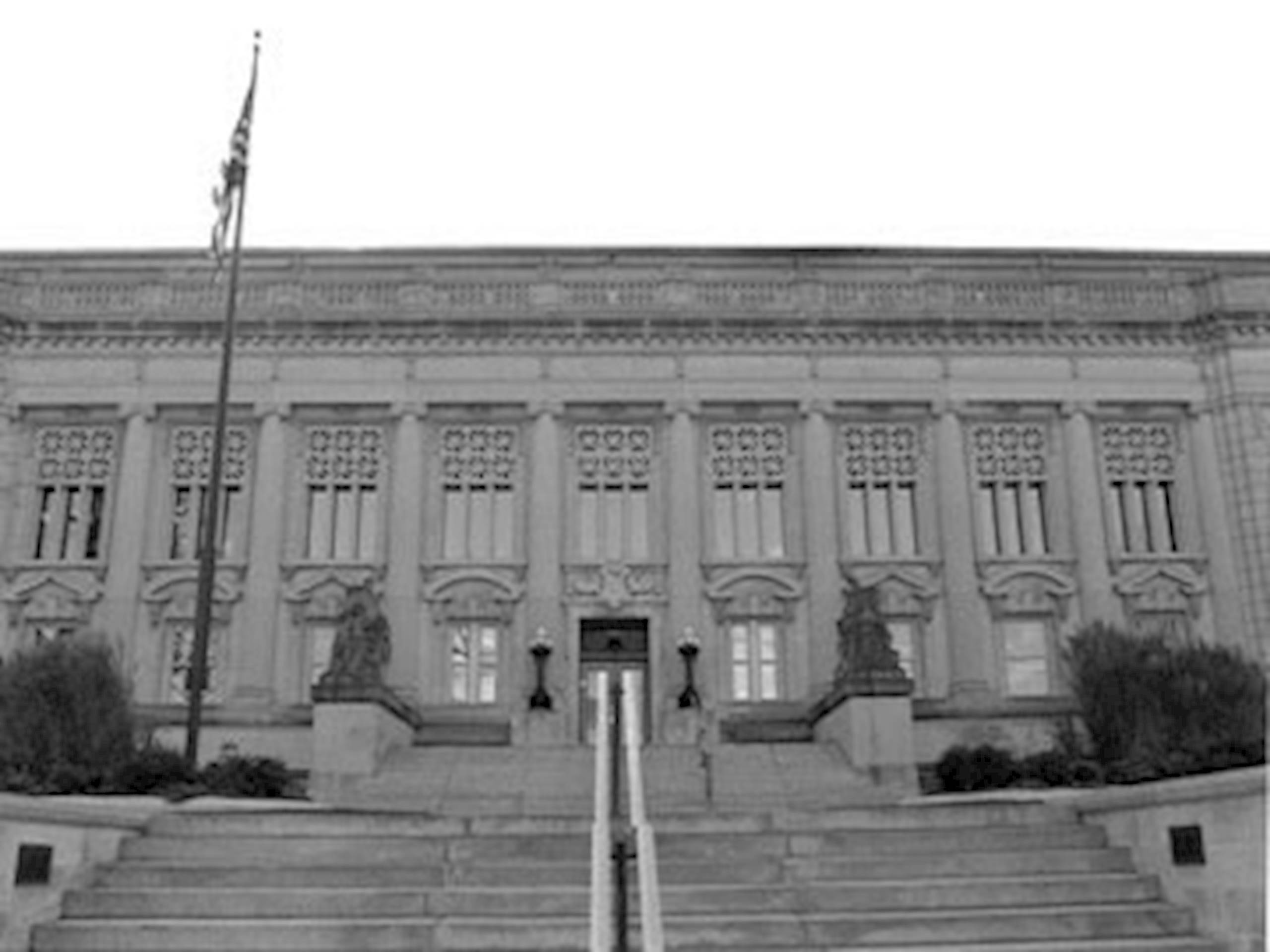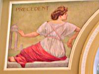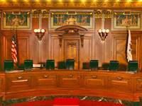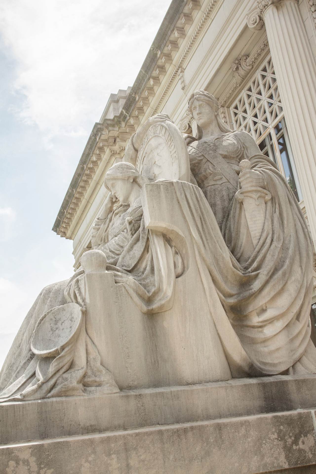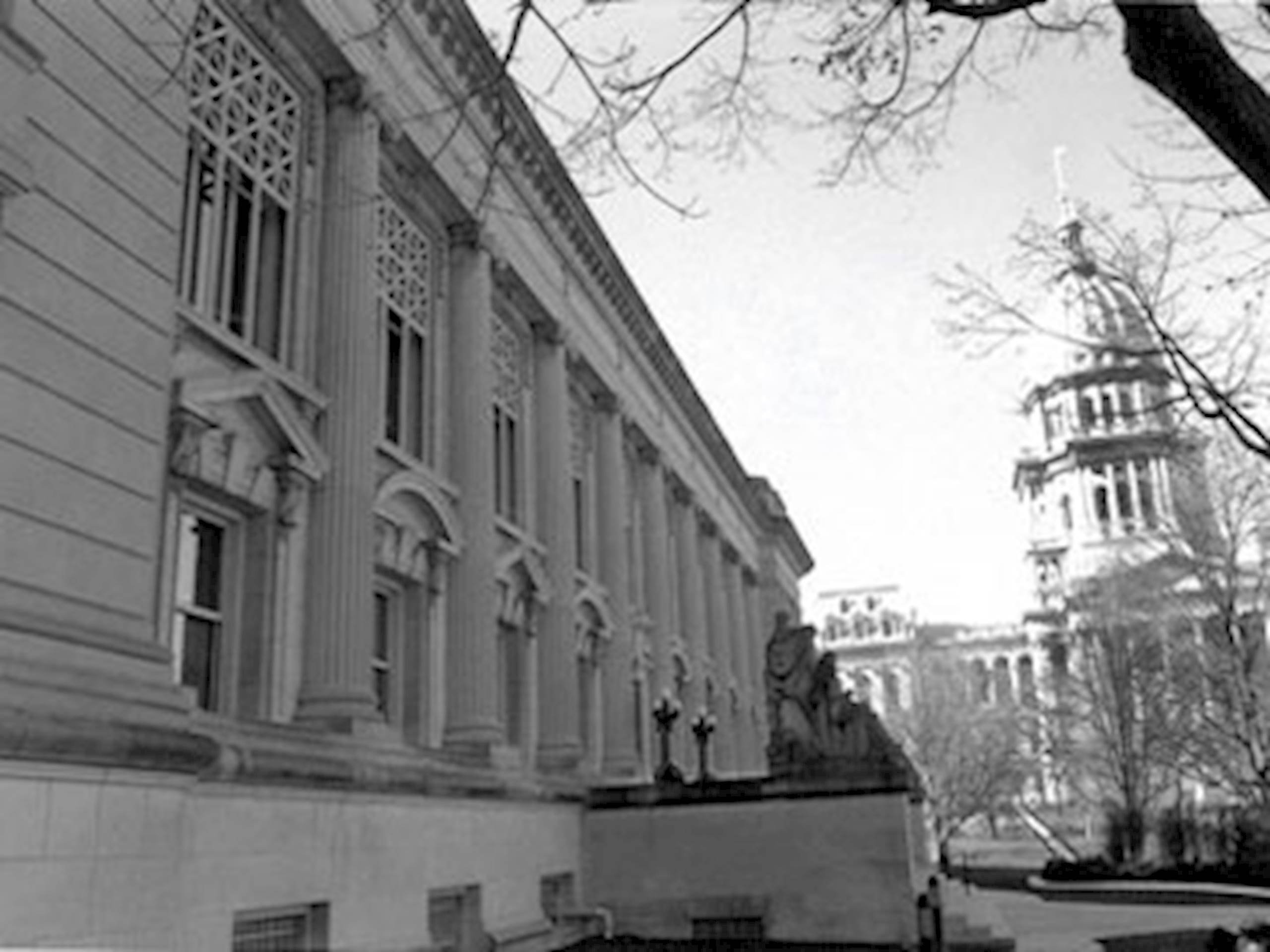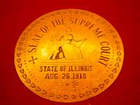 Images of the Illinois Supreme Court Building including: The exterior of the building, courtrooms, artwork, and the Supreme Court Library