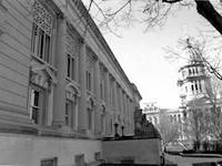 In Springfield, the Supreme Court held its first sessions in the Episcopal church at the southeast corner of Third and Adams Street. It later sat in what is now known as the Old State Capitol Building and, after that, until 1908 in the present State Capitol Building. The former Courtroom of the Supreme Court in the State Capitol Building is now used as a committee hearing room by the General Assembly. The current Supreme Court Building was erected at a cost of $450,500. At dedication ceremonies, Chief Justice John P. Hand accepted the keys to the building on February 4, 1908.
